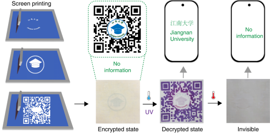 通过丝网印刷方法将TCM,PCN,DCM印刷到织物上,制备出具有动态变色特性的图案。“JNU”标志表现出热致变色行为,用作温度引起的颜色变化的安全特征,字母“JNU”在紫外光照射下表现出动态颜色变化,用作光引发颜色变化的安全特征。丝网印花图案展现了对多种刺激(如温度和紫外光)的动态响应,适合用作动态防伪和信息加密。