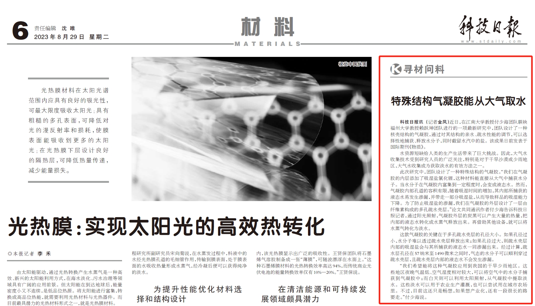 “长风破浪会有时,直挂云帆济沧海。”科研路上余治华砥志研思,求真务实,他的研究成果大幅提升了大气集水材料的使用寿命。他对纤维素气凝胶设计了一种核壳润湿性梯度结构,从根源上解决了吸湿盐泄漏带来的安全隐患。“想做一些新的东西,具有实际价值的东西”,正是朝着这样的目标方向,他从实际出发,推动了大气集水材料的创新发展和安全问题的有效解决。靡不有初,鲜克有终。余治华坚信无论做什么,只要始终保持着最开始时饱满的激情和状态就一定会成功,他也始终牢记自己走上科研道路的初心,秉持着对自然真理的追寻热爱和经世致用的使命担当,他坚持不懈地攻克了一个又一个科研难关,他的最新成果发表在Cell的子刊Matter上,该项成果被《科技日报》、《科学网》等主流媒体重点报道,科研成果若继续进行工业化探索,有望缓解干旱少雨地区的缺水问题。