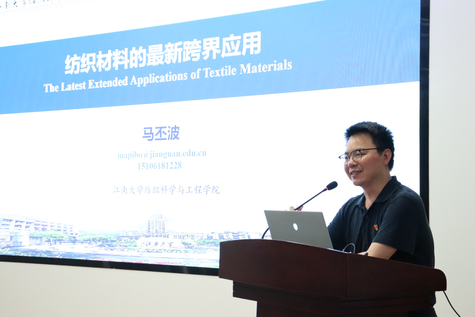 讲座完毕,马丕波教授与在场的同学们进行了互动讨论,对同学们关于做科研所需的学历程度、学科交叉所需的准备等问题做了详细的回复,鼓励同学们多多跨学科了解知识,提高专业技能,勉励同学们纺出未来,织出彩虹,为未来的中国纺织工业储备力量。