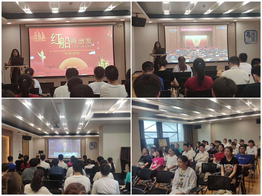 硕士第三党支部党支书原韵以视频的形式带领党员们学习贯彻习近平新时代中国特色社会主义思想,重点讲解“红船精神”,倡议全体党员在新的实践中继承和弘扬“红船精神”,不断强化前列意识,切实把“走在前列”的要求体现到精神状态上,贯彻到衡量标准上,落实到各项工作上。