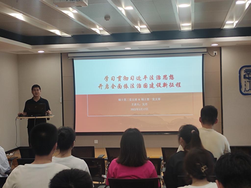 活动中,硕士第三党支部组织委员吴丹老师希望两个支部的同志能真正做到静下心来学习、沉下心来思考、潜下心来感悟,自觉沿着习近平新时代中国特色社会主义思想指引的方向持续精进,向上向善。随后,吴丹以《学习贯彻习近平法治思想开启全面依法治国建设新征程》为题,给两个支部党员们上了一节生动的党课。