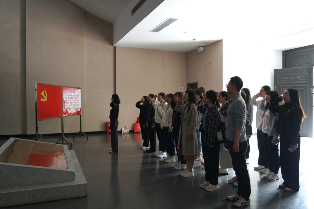 在展馆的革命烈士雕塑前,博士第一党支部书记郑晴带领各位党员重温入党誓词。党员们庄严而立,高举右拳,以铿锵有力的誓词筑牢共产党人的初心使命。