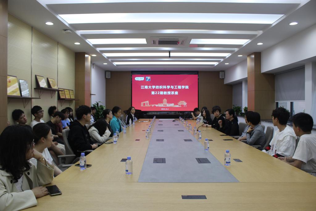 第22期“教授茶座”在学院A306会议室开讲。本期茶座邀请杰出校友,研究员级高级工程师,无锡一棉纺织集团党委书记、董事长周晔珺,与30余名纺织学子围坐漫谈,从“我与四虎