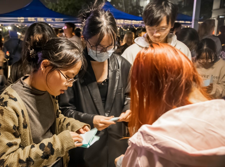 迎新文化节主要开设十个活动摊位,分别为心愿祈福、你捏我猜、贴贴壶、挤眉弄眼吃饼干、盲盒猜古诗、奖品发放、丝网印花特色体验、纸鸢社川崎玫瑰制作、汉风社投壶比赛和创意扎染设计大赛优秀作品展。同学们被别具匠心的特色活动深深吸引,纷纷驻足观赏、体验、互动。心愿祈福中,有师生写下对未来的期许,也有师生表达对家人朋友的美好祝愿……;盲盒猜古诗活动中,大家在欢乐愉快的氛围中展示自己的文化底蕴,同时继续收获新的文化知识;你捏我猜和贴贴壶活动中,每个人都开动思维、显示技巧,依靠自己的双手来传递力量;挤眉弄眼吃饼干游戏中,同学们在一片欢声笑语中收获满足与快乐。