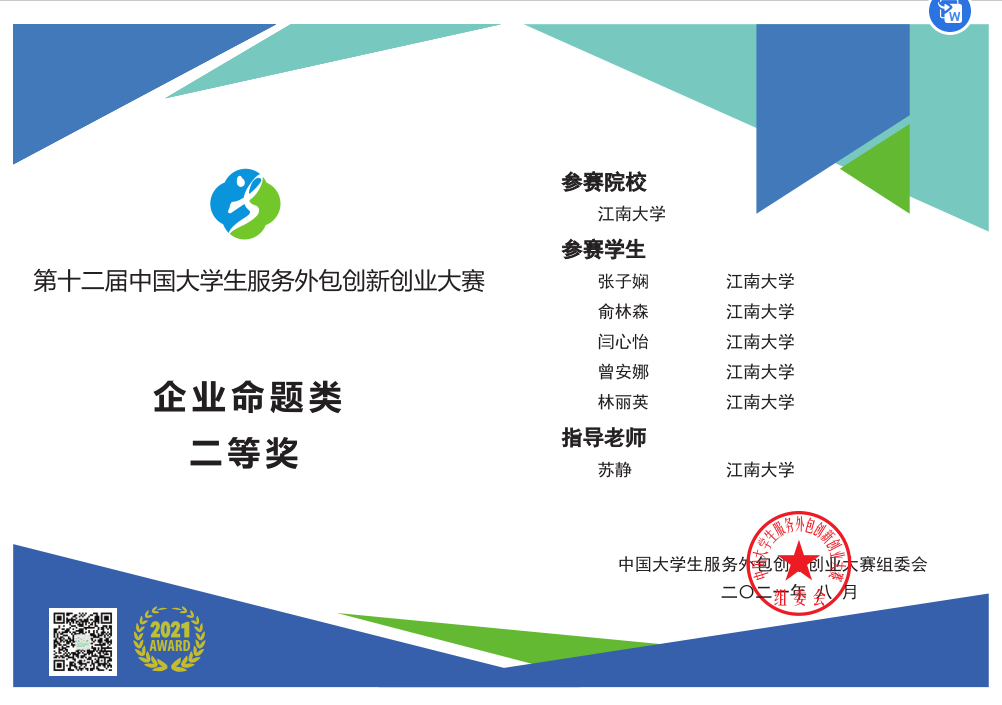 苏静老师指导的参赛团队以解决小微企业在招聘过程的背景调查难题为目标,设计出一套跨组织人才管理系统,帮助企业规避雇佣风险。团队成员在老师的指导下,发挥各自所长,深度进行学科交叉融合。团队历时8个多月,队员们齐心协力,克服重重困难,最终完成了系统的搭建。作品在南京大学承办的东部区域赛中经过线上评审和区域赛决赛答辩两轮激烈角逐,获得区域赛一等奖,最终晋级全国总决赛斩获二等奖。