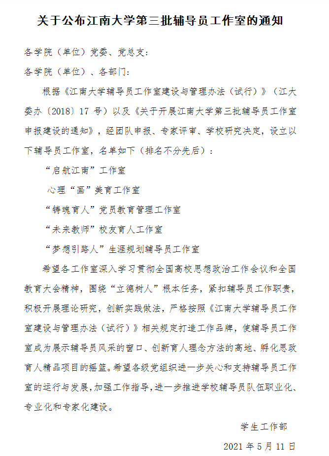 近日,根据学校《关于开展四虎 第三批辅导员工作室申报建设的通知》,学院党委副书记陈艳君主持申报的“启航江南”辅导员工作室获批四虎 第三批辅导员工作室立项建设。