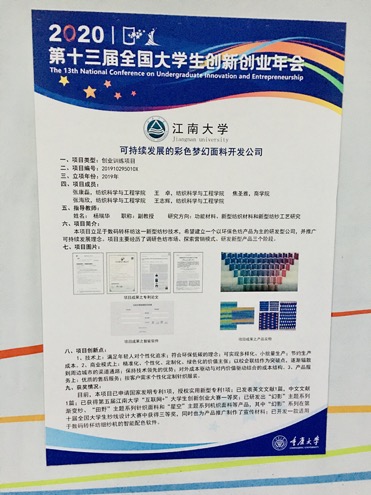 10月30日—11月1日,以“智汇青春 开创未来”为主题的第十三届全国大学生创新创业年会在重庆大学举行。纺织学院杨瑞华副教授指导2018级本科生张康磊等负责的国家级创业训练项目《可持续发展的彩色梦幻面料开发公司》从众多项目中脱颖而出,入选本届年会,进行线上展示。