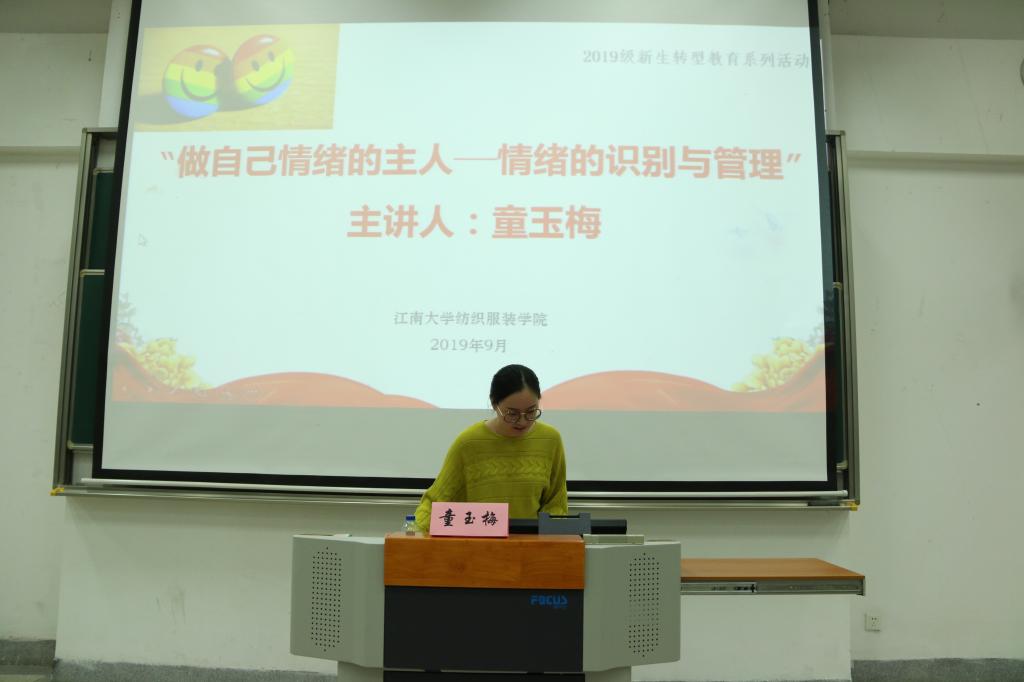 2019923日晚,纺织服装学院2019级全体本科生、研究生在第二教学楼2A127参加了大学生心理健康讲座。四虎 心理健康中心国家二级心理咨询师童玉梅老师围绕“做自己情绪的主人——情绪的识别与管理”这一主题开展讲座。