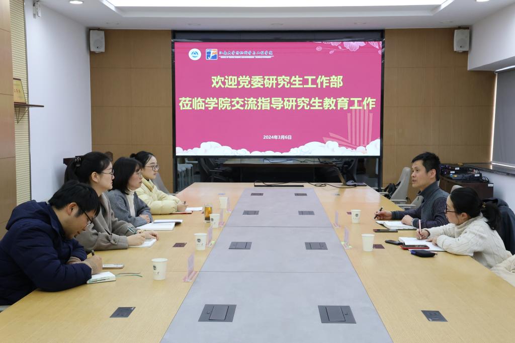 陈周充分肯定了学院前期在研究生思政工作中取得的成效,并对学院在研工体系建设、导学氛围营造、评奖评优机制修订等方面的探索提出建议,希望学院依托学科优势,多措并举推进研究生思政教育守正创新,实现高质量发展。杨莉勤对党委研究生工作部长期以来对学院工作的指导和支持表示感谢,并介绍了学院在网格化管理、奖优机制、典型选树等方面的做法与探索。与会双方还围绕导学思政、心理健康、生涯规划、典型培育等话题探讨交流。