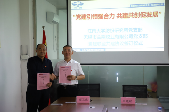 加强优势互补、深化校企合作。无锡市兰翔胶业有限公司董事长卓理财与支部高卫东教授分别作为双方代表,共同签署了《党建联盟协议书》,双方约定将根据“党建引领、行业领跑、产业链接、互促共进”的整体思路,围绕中心、服务大局,优势互补、资源共享,以“党建+”赋能,进一步探索开辟在教学实训、就业创业、协同创新等多领域的合作新路,共同服务纺织行业数字化转型和纺织人才高质量发展。