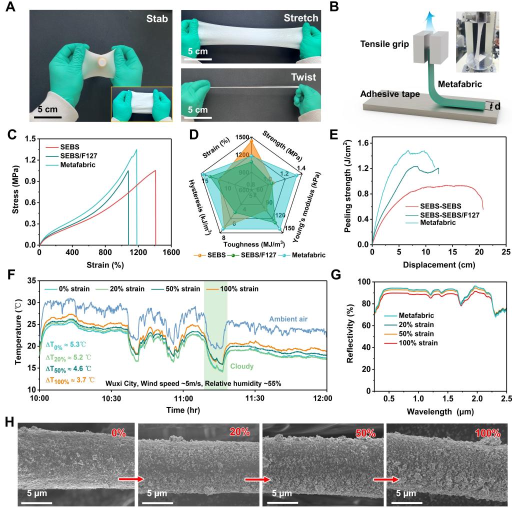 魏取福教授、吕鹏飞研究员提出了一种具有单向导湿的非织造布超织物,结合了辐射冷却和蒸发散热,以实现高性能的个人热、湿管理。这种超织物通过大规模静电纺丝和分层结构设计表现出优异的光谱选择性(太阳光反射率≈92%,大气窗口热发射率≈97%)和Janus润湿性,并且还具有优异的弹性、透气/透湿性。可实现低于环境温度约6.5 °C的降温性能和快速的吸湿排汗作用(水分蒸发率为0.31 g h-1,水分传输指数为1220%)。此外,可以通过施加各种应变(0-100%)来调节超织物的冷却性能。超织物的成本效益和良好的可穿戴性为可持续能源、智能纺织品和热湿舒适应用提供了一种普适策略。以上研究成果近期以“Dynamically Tunable Subambient Daytime Radiative Cooling Metafabric with Janus Wettability”为题,发表在国际权威期刊《Advanced Functional Materials》上。四虎