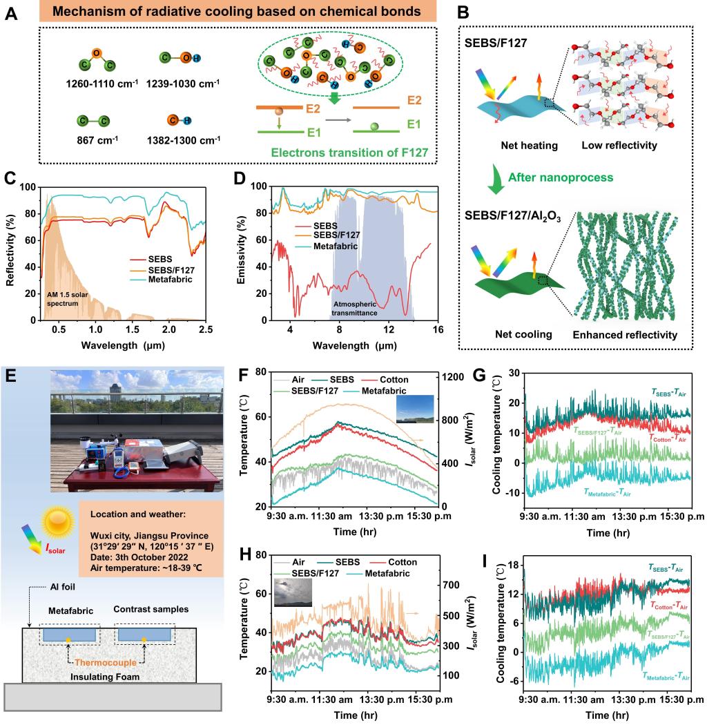 3.将生物相容性F127聚合物和高折射率(n≈1.8)Al2O3光散射体集成到SEBS织物上时,该层级结构超织物具有很高的光谱选择性。在晴天(~6.5oC)和阴天(~4.5oC)都能实现优异的亚环境温度冷却。F127的加入一方面增强了热辐射发射率;另一方面,它在定向输送汗液中起关键作用。具有高太阳反射率的Al2O3纳米颗粒同时提供了一个粗糙的微纳米纤维表面,促进汗水蒸发,实现“一石二鸟”的功能。