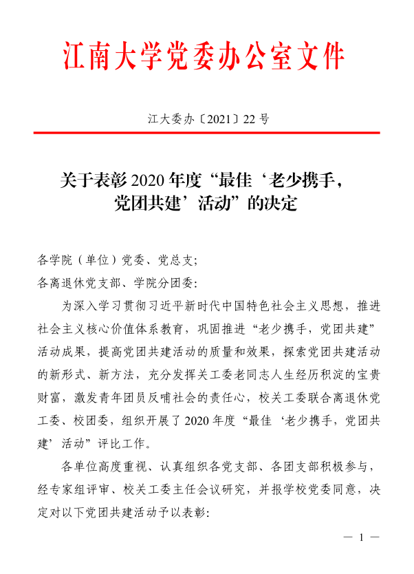 近日,学校党委公布了《关于表彰 2020 年度“最佳‘老少携手,党团共建’活动”的决定》,经专家组评审、校关工委主任会议研究,并报学校党委同意,四虎