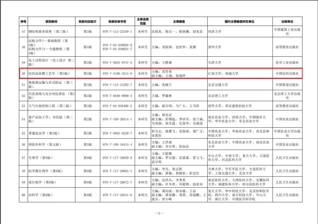 近日,国家教材委员会公布了首届全国教材建设奖获奖名单,由纺织学院范雪荣教授主编的《纺织品染整工艺学(第3版)》喜获“全国优秀教材(高等教育类)一等奖”。