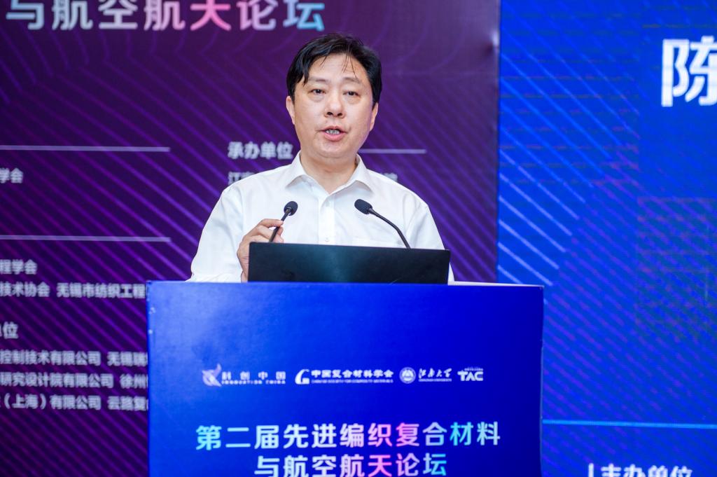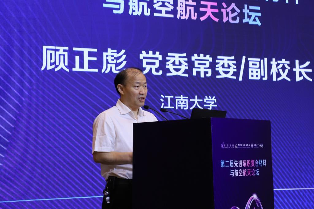 致辞,顾校长介绍了学校及纺织学科的发展情况,并对本次会议主办单位及协办单位表示了衷心的感谢。他表示,本次论坛的举办将深入研讨先进编织复合材料产业学科与发展动态前沿趋势,充分展示先进编织复合材料技术应用,有助于推动长三角航空航天用先进编织复合材料产业发展。