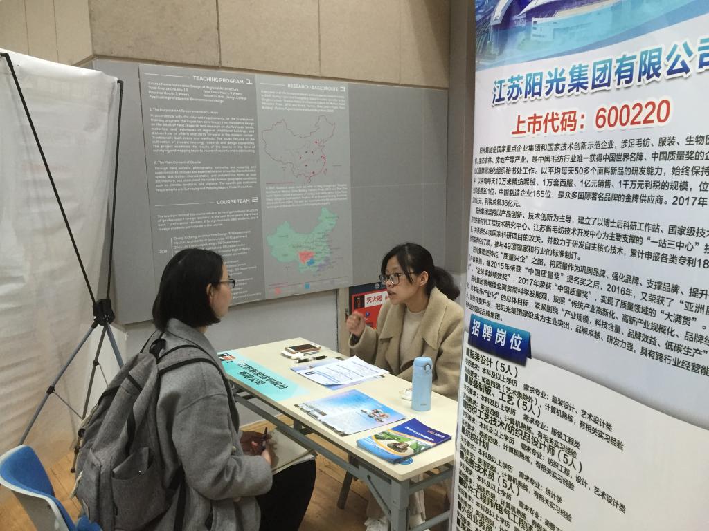 2019届毕业生共517人,其中本科毕业生363人,研究生毕业生154人。本次招聘会共有来自省内外的58家纺织、轻化、服装行业的单位参会,其中包括中国纺织对外经济技术合作有限公司、江苏阳光集团有限公司、江苏国泰华盛实业有限公司、云蝠投资控股有限公司等国内知名企业,共为毕业生提供就业岗位1128个。本科生平均起薪:6000元/月,研究生平均起薪:8000元/月。