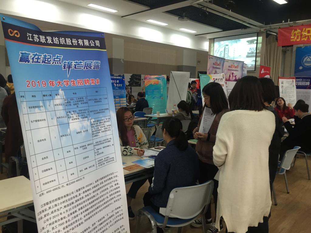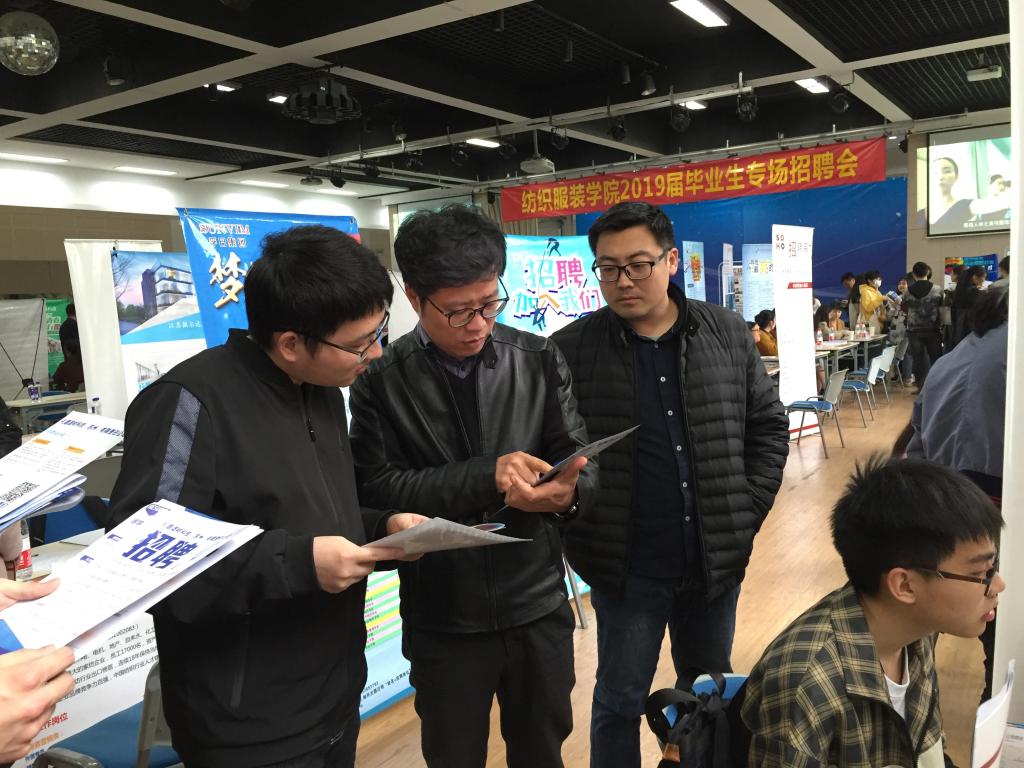 2019届毕业生共517人,其中本科毕业生363人,研究生毕业生154人。本次招聘会共有来自省内外的65家纺织、轻化、服装行业的单位参会,其中包括江苏省纺织研究所股份有限公司、通标标准技术服务有限公司、江苏红豆国际发展有限公司、浙江恒逸集团有限公司等国内知名企业,共为毕业生提供就业岗位1254个。本科生平均起薪:6000元/月,硕士研究生平均起薪:8000元/月,博士研究生平均起薪:12000元/月。