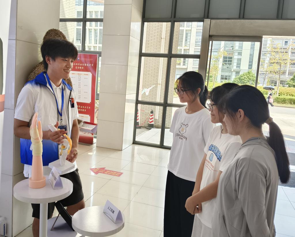 在“纺织科技成果”展示区,展出服饰用、医用、军用等多领域的纺织科技成品,如医用绷带、人造肌腱、伪装服等。通过桌牌介绍与专人讲解,探访前沿技术,带领新生直观感受现代纺织“问天探海,万物可织”的独特魅力,增强专业自信心与认同感。