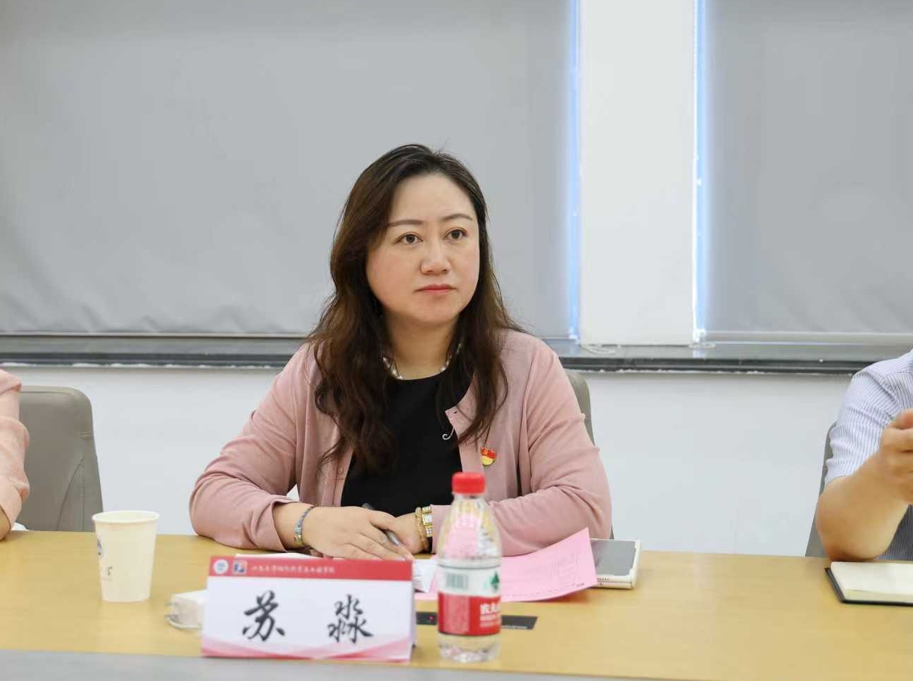 (国际丝绸学院)党委书记苏淼、院长于斌一行莅临学院调研交流,学院全体在校班子成员接待了来访嘉宾,党委书记张菁燕致欢迎辞并主持了联学交流座谈会。