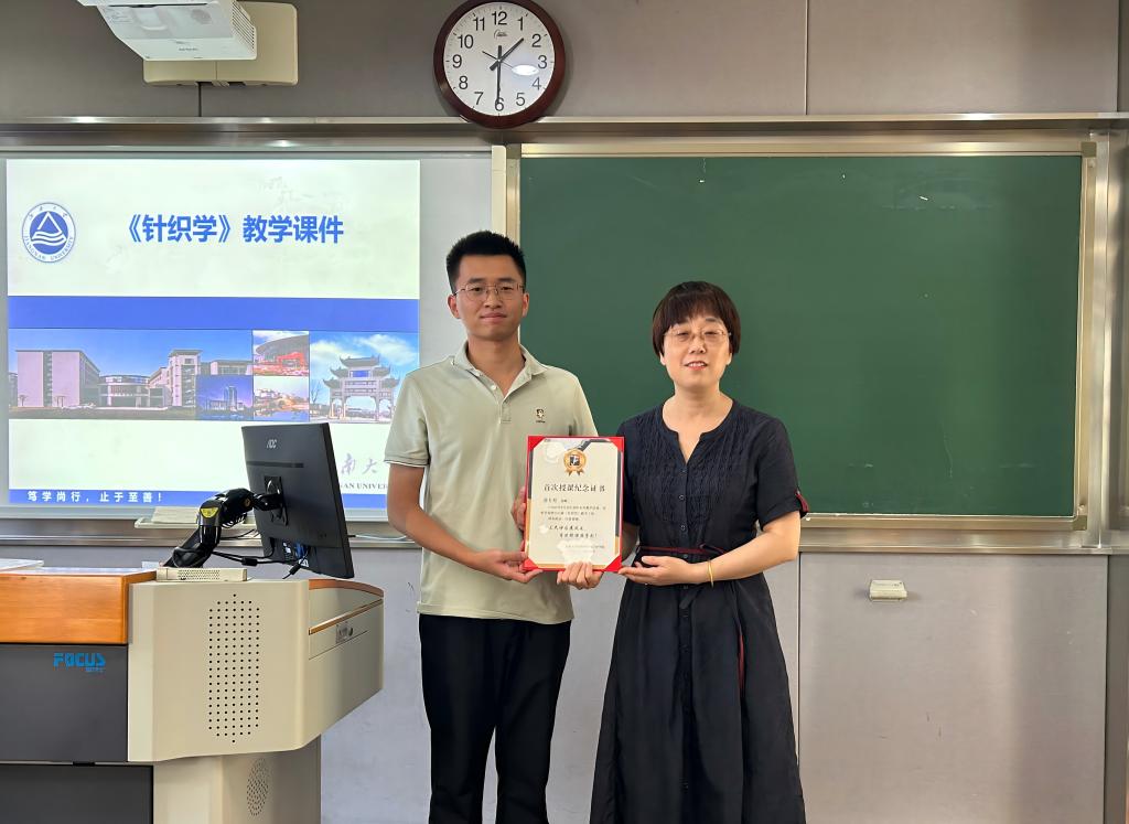 ,经过半年的岗前培训与教学准备,9月份首次为纺织2303班讲授《针织学》课程。颁发仪式上,张菁燕介绍了薛老师的学习经历和在读博期间取得的成就,她希望薛老师能将自身扎实的学术基础和创新思维带入课堂,为学院的教学工作注入新的活力。同时,她也鼓励薛老师在今后的教学道路上不断探索,积极践行“教学相长”理念,持续提升教学质量,成为深受学生喜爱和尊敬的“四有好老师”。