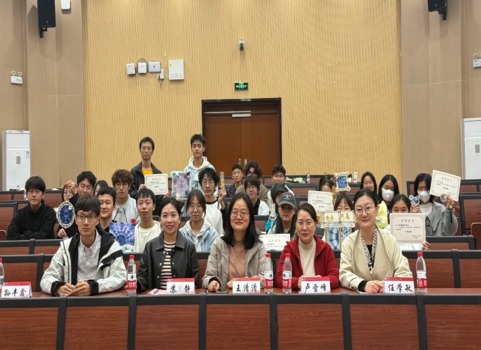 第五届“新声织经纬,纺韵染未来”创意扎染设计大赛决赛在第一教学楼1C109顺利举办。学院纺织工程系副主任王清清,轻化工程系副主任苏静,班主任代表卢雪峰、孙丰鑫,学院学工办主任兼分团委书记任学敏老师出席大赛并担任评委,学生参赛团队及学生会工作人员参与活动。