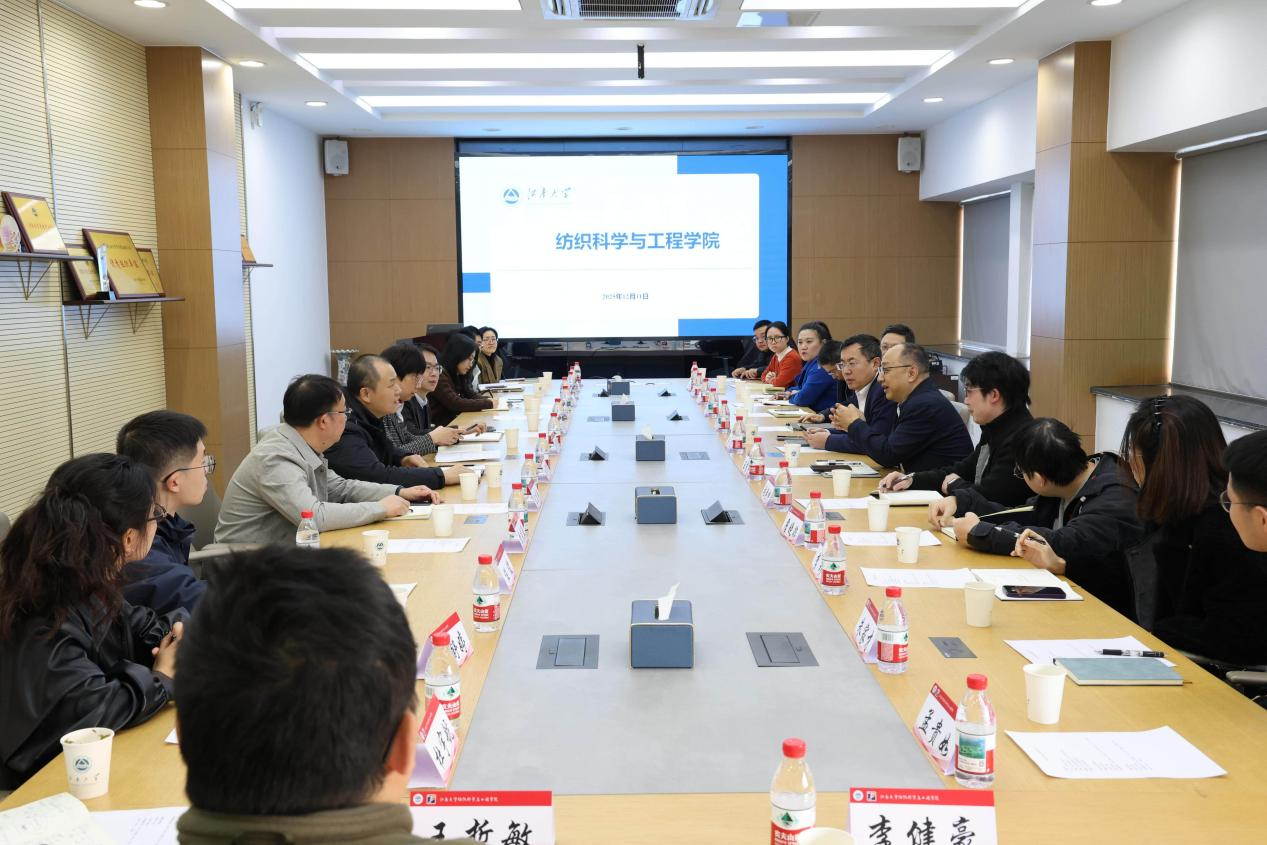 开展纺织与机械两个学院联合专题调研。本次调研围绕学校如何与学院协同推进科研项目申报、优化学科发展布局等议题展开深入交流,旨在凝聚共识、形成合力,共同推动学校科研创新体系建设。