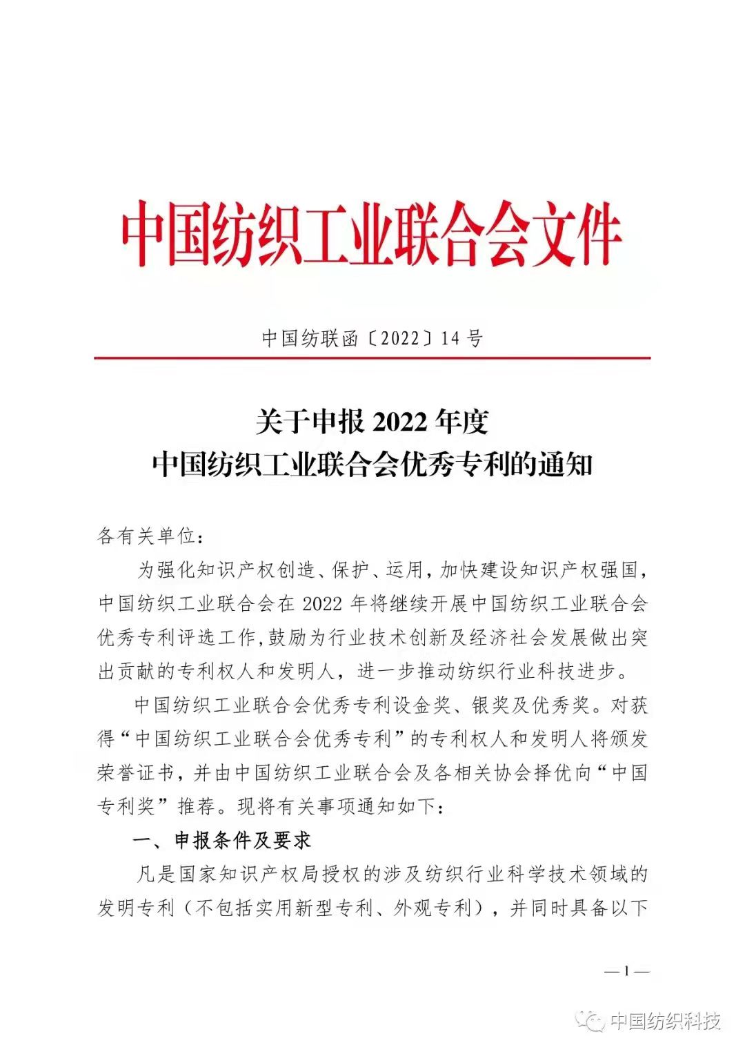 关于申报2022年度中国纺织工业联合会优秀专利的通知