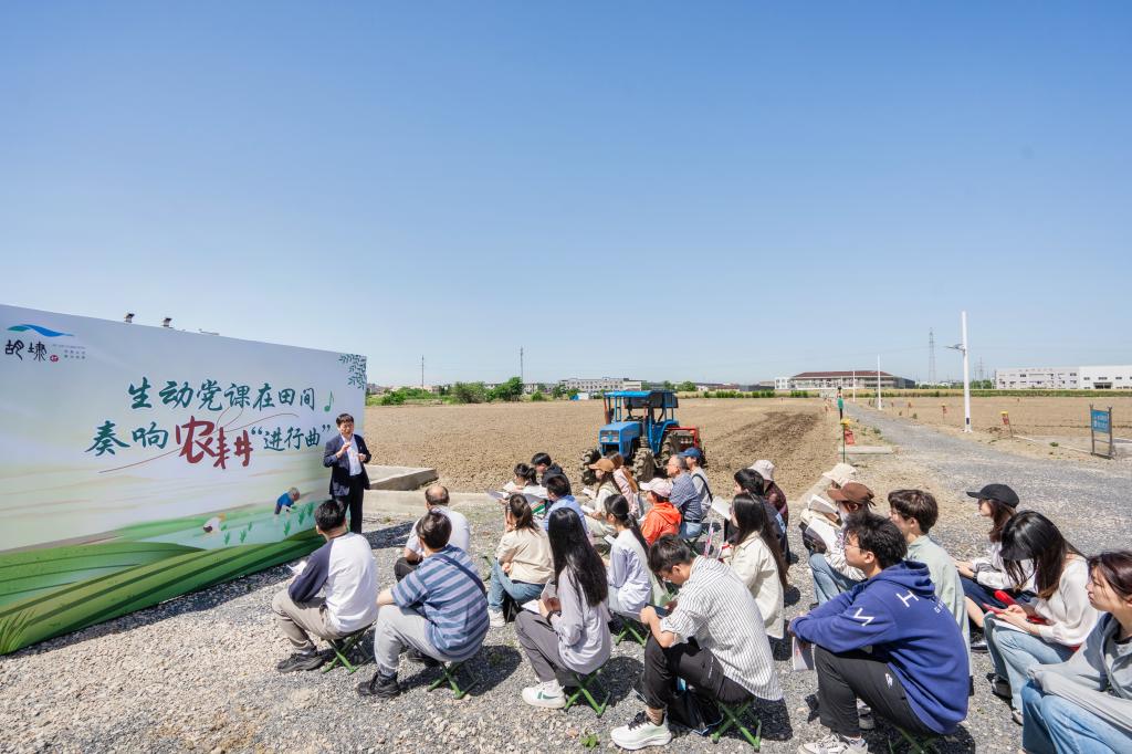 老师和同学们依次来到胡埭村西河头公园,了解慈善超市、健身步道、运动场馆、友邻客厅等功能区设置,并参观胡埭村村史馆和退役军人服务站,深入体会胡埭镇欣欣向荣、服务基层、体恤退役军人的良好风貌,聆听胡埭村的历史故事,感受浓厚的乡土文化。随后,师生一行来到胡埭村示范田园区,村党总支书记杭群民以《绿野农耕,生态先行——共筑乡村振兴新篇章》为主题带来一堂生动又具体的田园党课,紧密结合农耕实践和当下生态文明建设与乡村振兴等热点话题,对习近平生态文明思想作深入阐述;同时,师生党员还就《中国共产党纪律处分条例》进行研讨交流分享,深化党纪学习,凝聚奋进力量。此外,师生们走进胡埭村生态基地参观学习,“沉浸式”感受社会主义新农村样板图,体味一分耕耘一分收获的喜悦。